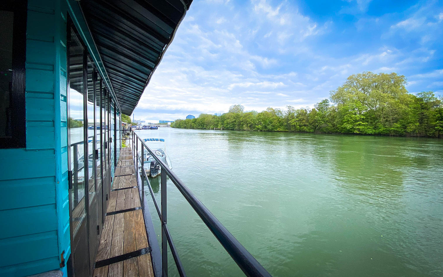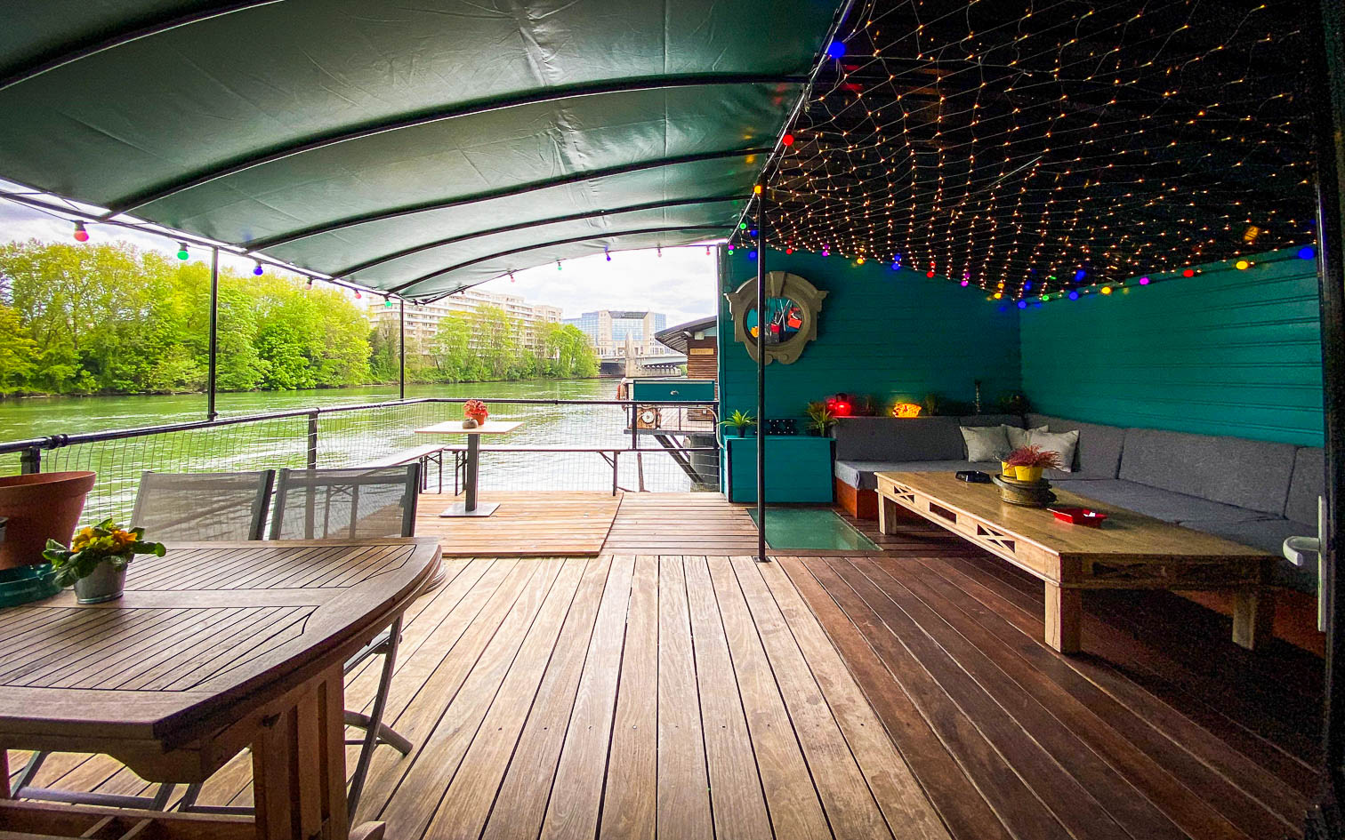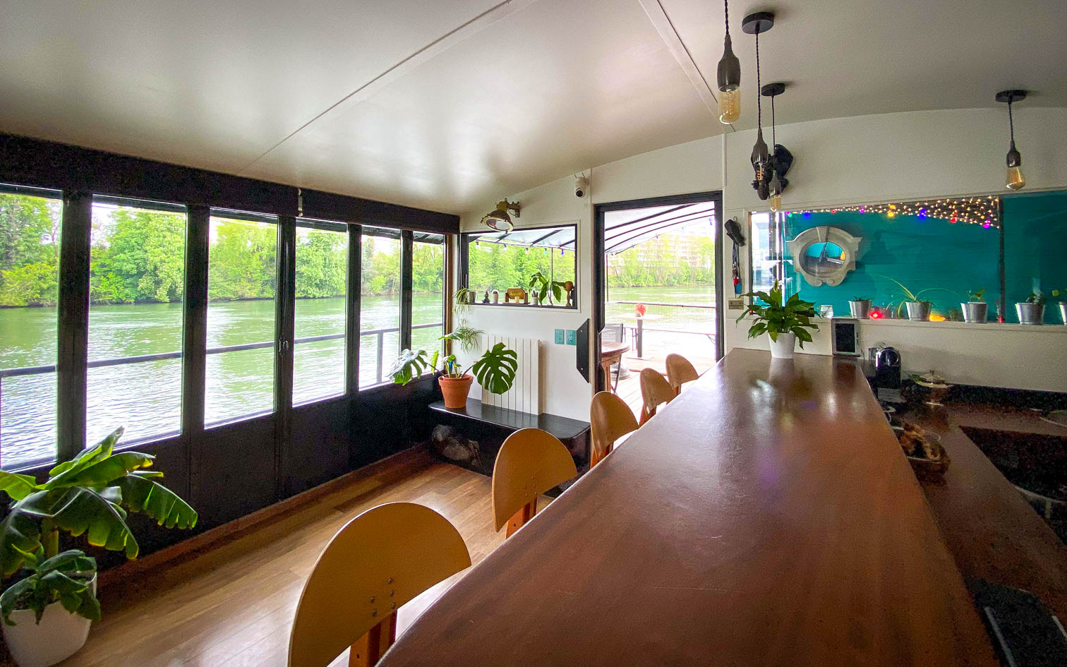 La péniche de Michel est amarrée sur un quai paisible aux portes de Paris. Elle offre une vue imprenable sur une berge boisée, dépourvue de vis-a vis. Dans cette ambiance chaleureuse et conviviale, elle peut accueillir jusqu’à 50 invités, et ce, jusqu’à 2h du matin.