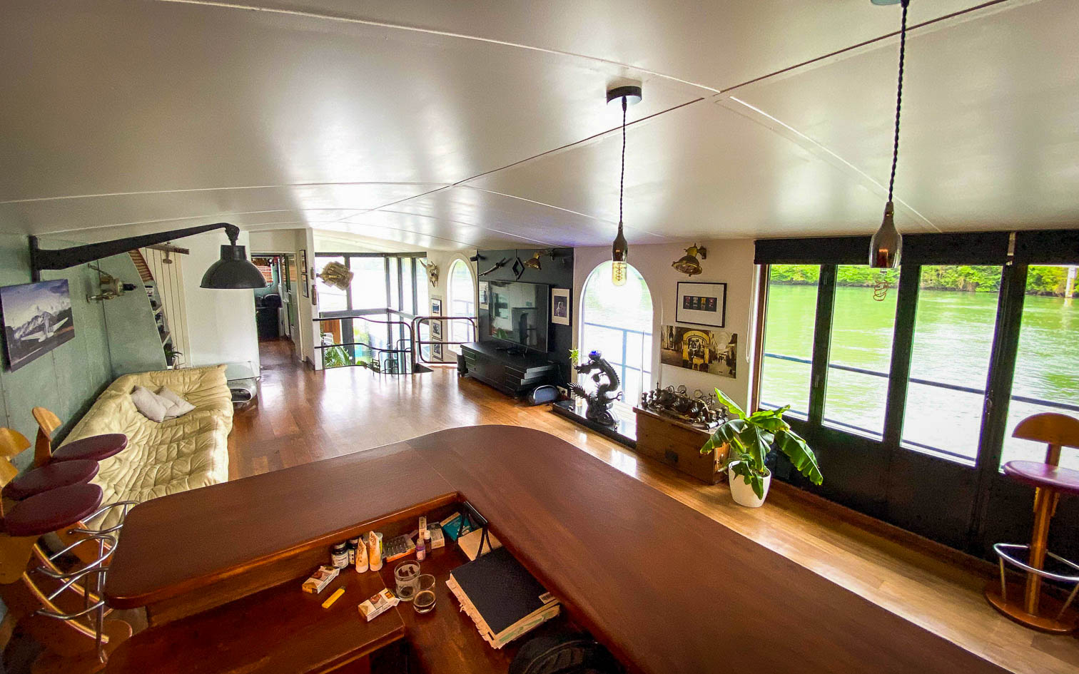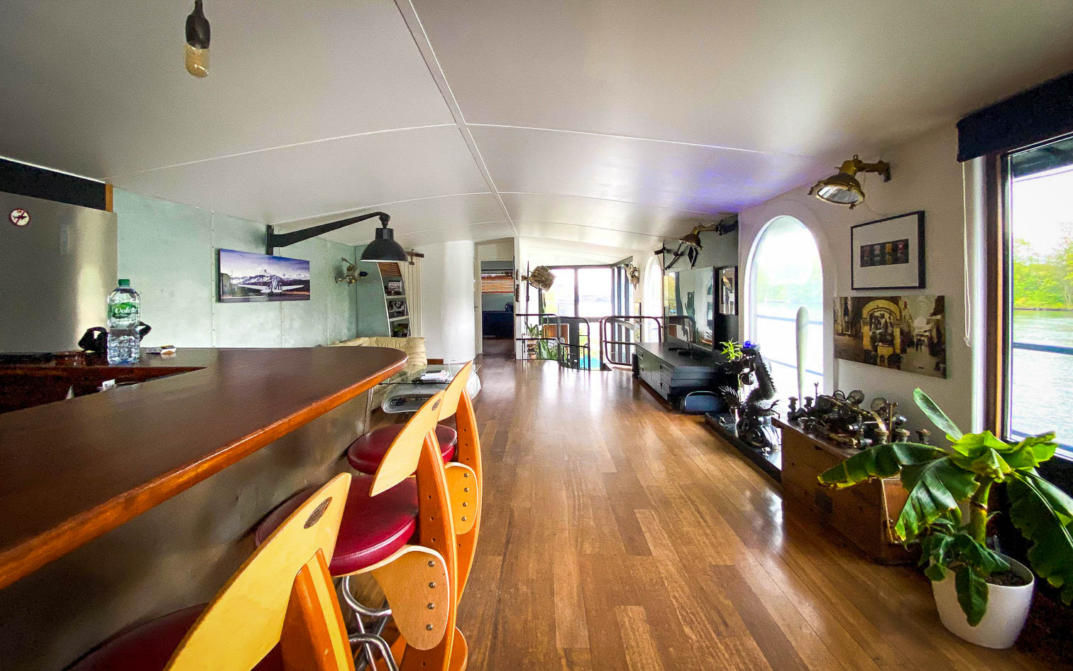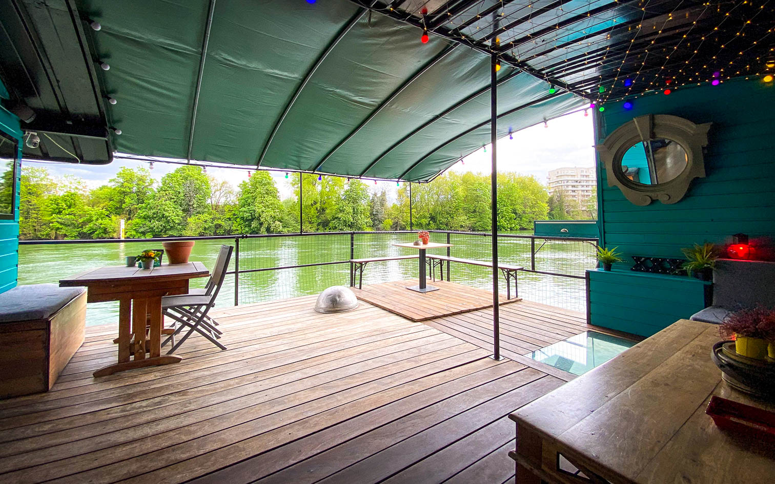 La péniche de Michel est amarrée sur un quai paisible aux portes de Paris. Elle offre une vue imprenable sur une berge boisée, dépourvue de vis-a vis. Dans cette ambiance chaleureuse et conviviale, elle peut accueillir jusqu’à 50 invités, et ce, jusqu’à 2h du matin.